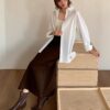 MELANI DENIM PENCIL MIDI SKIRT IN BROWN